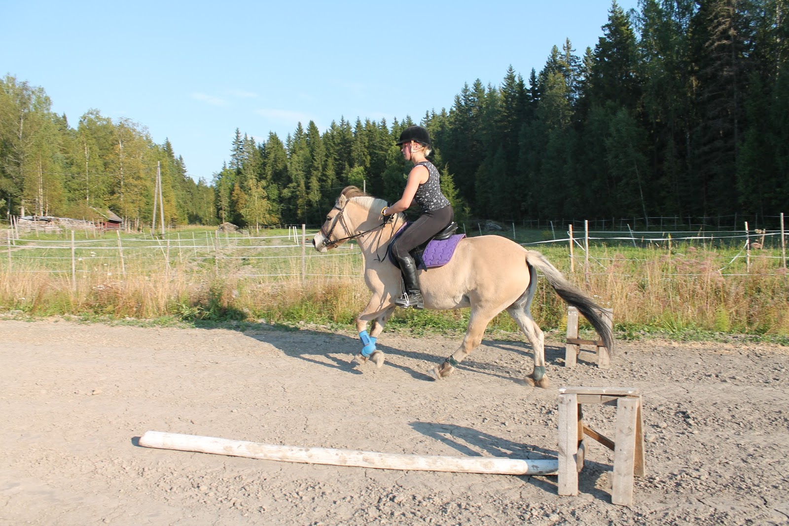 Senna kävi tänään ratsastamassa Iitulla. Lupasin nostella puomeja jos Senna haluaisi hypätä ja sit mentiin. Senna lämppäsi Iitun laitumella ja sitten siirryttiin pellolle hyppäämään. (Tuo pelto on jo kuorittu valmiiksi kenttää varten). Aloiteltiin kavaleteista, jotka Iitu vain ravasi ja laukkasi yli.